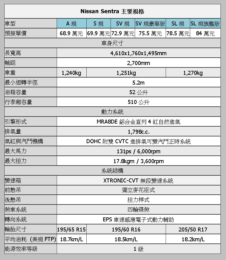 在發表前夕,裕隆日產也已公布了新Sentra的預售接單價,範圍從A規的68.9萬元到SL規的84萬元,相信今年第四季這場與TOYOTA新Altis所一同掀起的國產中型房車之戰會相當有看頭。