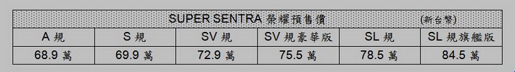 台灣國產汽車史上銷售冠軍車種NISSAN SENTRA車系,累積銷售46萬台,獲得廣大消費者肯定,全新世代車款重現台灣市場,並以 NISSAN SUPER SENTRA為名,除了擁有1.0L節能小車的燃油經濟性,平均油耗18.7KM/L,更提供媲美3.0L大型豪華房車的空間與舒適,裕隆日產汽車搶先推出SUPER SENTRA限時「榮耀預購禮遇」優惠活動,再享多重早鳥優惠。