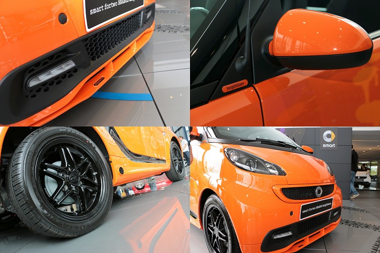 smart fortwo BRABUS limited ed. knightblaze 車型:52kw mhd passion • 橘色車身鈑件及水箱護罩及車側後視鏡罩 • 黑色 tridion 安全車體 • knightblaze 限量版專屬徽飾 • BRABUS 15吋六幅雙肋式黑色鋁合金輪圈 • BRABUS 黑色頭燈組 • BRABUS 前擾流板及側裙 • BRABUS 專屬三幅式運動方向盤 • BRABUS 專屬排檔桿頭及手剎車拉桿 • BRABUS 專屬鋁質腳踏板 • BRABUS 專屬腳踏墊 售價:850,000 smart fortwo limited ed. nightpurple 車型:52kw mhd pure • 雪白色車身鈑件 • 夜紫色 tridion 安全車體 • nightpurple 限量版專屬徽飾 • 黑色皮質包覆儀表板 • 黑色皮質座椅 • 兩幅式方向盤 售價:690,000