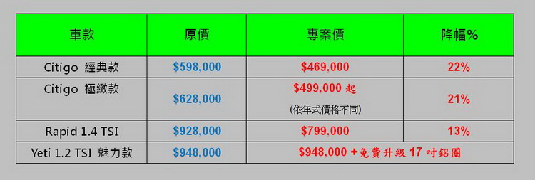 回饋消費者 全面啟動Citigo、Yeti、 Rapid超值促銷專案為了回饋消費者,ŠKODA再加碼推出Citigo、Rapid、Yeti 三款熱門車款的超值專案價:限量推出Citigo Fun膽價,Citigo 經典款,原價59.8萬,現金價46.9萬;Citigo極緻款,原價62.8萬,現金價49.9萬起,降幅皆超過2成以上;獲得2013德國紅點設計大賞,同級最佳歐洲造車工藝Rapid,推出震撼車壇價79.9萬超殺專案,並可選擇【輕鬆貸專案】首年低月付8,888,再享首年乙式全險;歐洲精品SUV - Yeti 1.2 TSI 魅力款超值價94.8萬,免費升級17吋鋁圈,限量30台。優惠詳情請速洽ŠKODA各地經銷商,也可撥免付費服務電話0800-658-588或上網(www.SKODA.com.tw)查詢。
