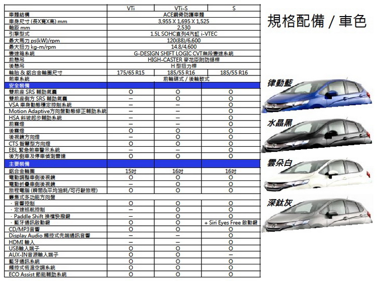 原本預計在10月初才要上市的第三代FIT疑似業代將內部教育訓練資料提前公佈在網路上,台灣本田今天乾脆正式發出新聞稿公佈售價與相關配備。台本表示第三代FIT將有FIT 1.5 VTi(63.9萬),1.5 VTi-S(66.9萬)以及 1.5S(69.9)萬元整三種版本,其中頂級版配備四安、VSA與Motion Adaptive方向盤動態方向盤修正系統,網友大推超值,呼籲直衝頂級版本。