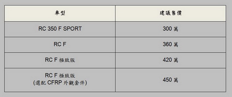 LEXUS總代理和泰汽車11月宣布正式發表RC 350 F SPORT與RC F雙門跑車。RC 350 F SPORT於去年東京車展首展充滿了跑車所強調的熱情與動感元素,而於今天底特律車展登場亮相的RC F也是繼LFA與IS-F之後,又一在車名中冠上「F」的LEXUS高性能車。
