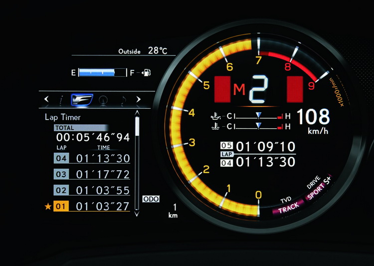 此外,為了讓駕駛更易於讀取所需的行車資訊,RC F配備的單環式賽車儀表板,在中央的大型儀表主要用於顯示於玩家而言最重要的引擎轉速、檔位資訊及車速,左方顯示幕則可顯示包括行駛模式、G值、胎壓、油耗等各種行車資訊,而為了提升駕馭樂趣,本次RC F更增加了單圈計時碼表,駕駛僅需按下方向盤右方按鍵,即可記錄自己每一圈的速度。