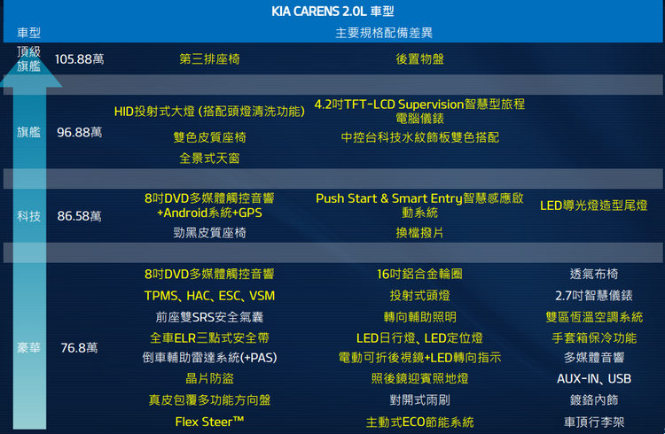 KIA第二款國產化新車Carens即將上市,同時推出五人座、七人座兩種版本共四種等級,售價自76.88萬至105.88萬。Carens為歐洲風格強烈的小型家庭MPV,動力搭載2.0升汽油引擎,除擁有強悍的休旅機能設計,車系標配具DVD/GPS功能的Android觸控影音系統以及ESC/VSM/TPMS等安全輔助科技,也是它的賣點。