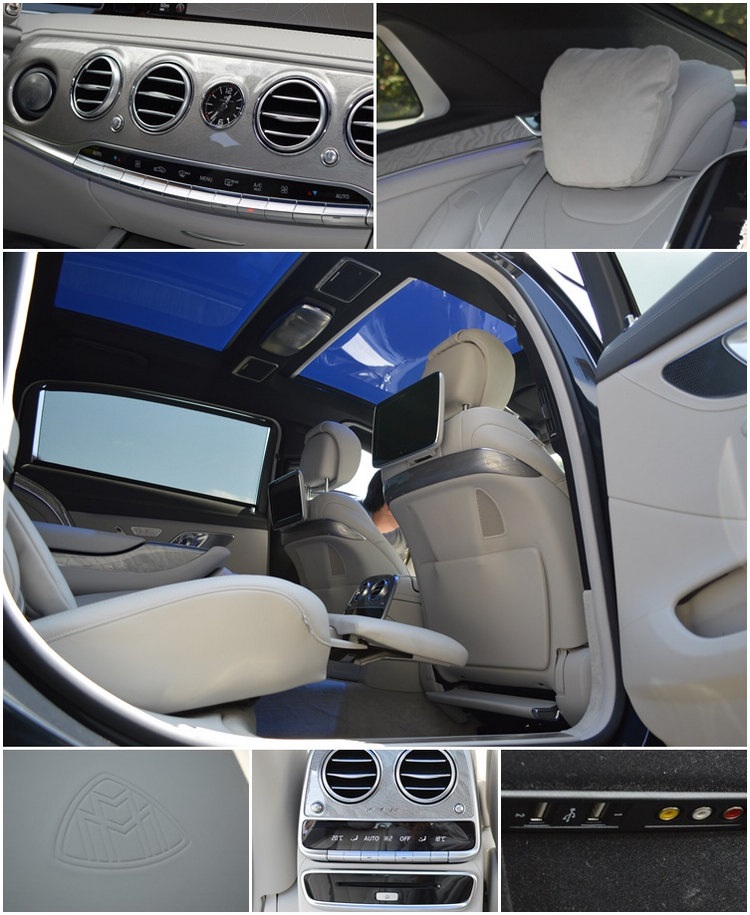 座艙內的雍容華貴堆砌至全新高度,針對實木飾板、鍍鉻裝飾到皮革運用皆以車壇最頂尖的角度打造,中控台四只鍍鉻冷氣孔中的IWC石英鐘與中央鞍座木紋飾板的MAYBACH字樣可見其細膩。於科技面的運用上同達巔峰,儀表板一路延伸到中控台上方的超大型顯示幕,由兩只12.3吋、8:3比例的液晶螢幕呈現,左方為整合多功能行車資訊顯示區的數位儀表,右方則為標準配備的COMAND Online多媒體系統顯示介面,具備MP3/WMA/AAC/WAV光碟播放格式,也具備6片式DVD播放器、藍牙串流功能,可使用手機上網,中央扶手內建的雙USB插槽與單SD插槽擴充音源格式,原廠3D中文導航系統給予最清晰的方向指引。