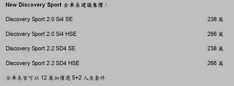 全車系標配電動啟閉尾門,HSE車款更標配全景式玻璃車頂,旅行沿途盡享開闊視野。SE車型配備Land Rover英國原廠190W輸出/10支揚聲器音響系統、HSE車型配備250W輸出/11支揚聲器含重低音音響系統。 New Discovery Sport提供2.0升Si4四缸渦輪增壓汽油引擎以及2.2升SD4四缸渦輪增壓柴油引擎兩種動力。柴油版並搭載Intelligent Stop / Start 智慧型熄火/啟動系統,擁有更傑出的油耗表現。Si4渦輪增壓汽油引擎可輸出240ps / 5,800rpm的最大馬力,以及340nm / 1,750rmp的最大扭力。SD4柴油渦輪增壓汽油引擎則可輸出190ps / 3,500rpm的最大馬力,以及420nm / 1,750rmp的最大扭力。