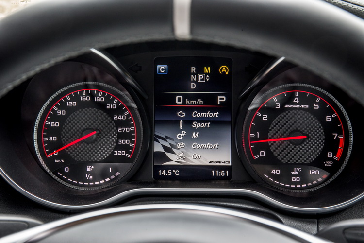 低調中蘊藏熱血 賽道基因豪華呈現 因循外觀的設計脈絡,座艙內同樣是華麗的運動氛圍。在原先The new C-Class的內裝格局中,全新Mercedes-AMG C 63賦予了絕頂的跑車化風格,換上AMG專屬黑色Nappa真皮三輻式平底方向盤,後方附上銀色鋁質換檔撥片,當駕駛雙手掌握其中,眼前更可領略AMG專屬儀表的精彩,碳纖維紋路的雙環儀表中央有著5.5吋多功能TFT彩色顯示幕,並整合AMG主選單與賽車計時器於其中。座艙中的專屬AMG配備,還包含有儀錶上緣、車門飾板、車門扶手與中央扶手等處的ARTICO皮質,而鋁質飾板則與門檻踏板及附上防滑橡膠凸點的不鏽鋼腳踏板等,共同營造出極具跑風與質感的座艙享受。最後,以黑色織布頂篷與AMG黑色腳踏墊,完成一致的華麗運動風。