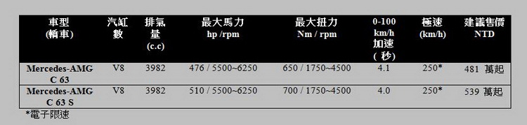 2014年,The new C-Class 濃縮當家旗艦S-Class王者典範,重新樹立新世代菁英座車里程碑,更於The new C-Class Estate車型上,於幸福家庭間取得完美平衡。如今,The new C-Class更將藉由Mercedes-AMG灌注自賽道淬煉而來的性能精華,成就最頂尖的C-Class性能王者-兼容尊榮視野與超凡跑格於一身的全新Mercedes-AMG C 63車系,提供C63與C 63 S兩種動力設定,售價分別新台幣481萬元與539萬元起。