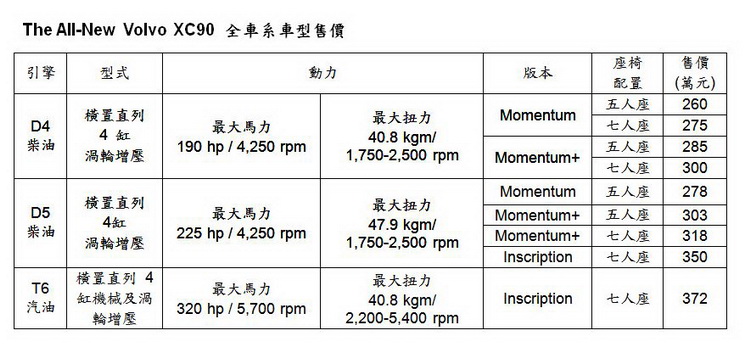 ![]() 繼成功發表 The All-New Volvo XC90 現行銷售主力 - 七人座車型 D5 Momentum+、D5 Inscription 及 T6 Inscription,國際富豪汽車再次強化產品銷售陣線,旋風引進 D4 Momentum 五人座車型、D4 Momentum 七人座車型、D4 Momentum+ 五人座車型、 D4 Momentum+ 七人座車型、D5 Momentum 五人座車型、D5 Momentum+ 五人座車型等 6 款全新車型,以全車系 9 款車型打造 VOLVO LSUV 頂尖陣容。