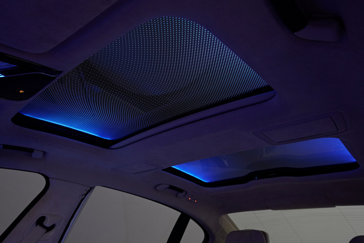 更純粹的駕駛導向座艙長軸車型標配之7吋後座專屬控制平板,能供後座乘客調整座椅角度、空調、遮陽簾、影音設備等超過20項功能,也可當作一般平板電腦使用,如:下載App程式或播放儲存內容。若選用Sky Lounge全景式玻璃天窗,即享有由超過15,000個光源點亮的頂篷。車內甚至還準備了香氛套件,8種不同的香味可根據個人喜好調配濃淡。 ![]() ▲Sky Lounge全景式玻璃天窗由超過15,000個光源點亮頂篷,看起來如夢似幻。