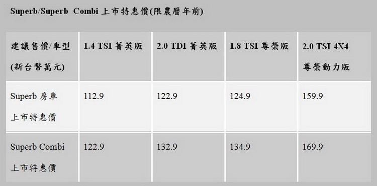 為了更貼近台灣消費者的需求,SKODA Taiwan此次所引進的New Superb旗艦車款在動力部份除了延續先前的1.8 TSI汽油引擎以及2.0 TDI柴油引擎兩款車型之外,又增加1.4 TSI入門車款,其動力輸出分別為: 1.4 TSI 菁英版150 匹馬力、25.5kgm; 1.8 TSI尊榮版 180匹馬力、25.5 kgm ; 2.0 TDI菁英版 150匹馬力、34.7kgm。