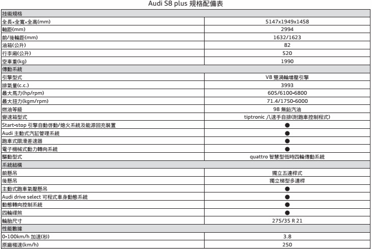 這款Audi S8 plus堪稱目前Audi房車陣容中最新、最強的頂級性能旗艦。動力科技自然是它最傲人的項目,與S8搭載同樣排氣量3993c.c.的V8 TFSI雙渦輪增壓附中冷器缸內直噴引擎,但經過引擎管理系統改寫、排氣閥門改造,以及渦輪內部結構幾何優化後,最大馬力從520hp一口氣竄升至605hp / 6100-6800rpm,峰值扭力更從66.3kgm / 1750-5500rpm提升為71.4kgm / 1750-6000rpm,在超增壓的狀態下扭力更達76.5kgm,拜重量僅231公斤的ASF(Audi Space Frame)全鋁合金概念車身結構所賜,搭載8速tiptronic手自排變速箱,透過扭力轉換系統,於低檔位下能提供極剽悍的高性能表現,從第1檔至第8檔間達7.0:1的超廣齒比分佈,更能善用S8 plus的每一分動力,在高檔位時創造更優異的油耗表現,以及更優異的速度延展性;高效能的供油幫浦及冷卻系統,能讓變速箱更快達到工作溫度,提供S8 plus優異的動力傳輸效率。