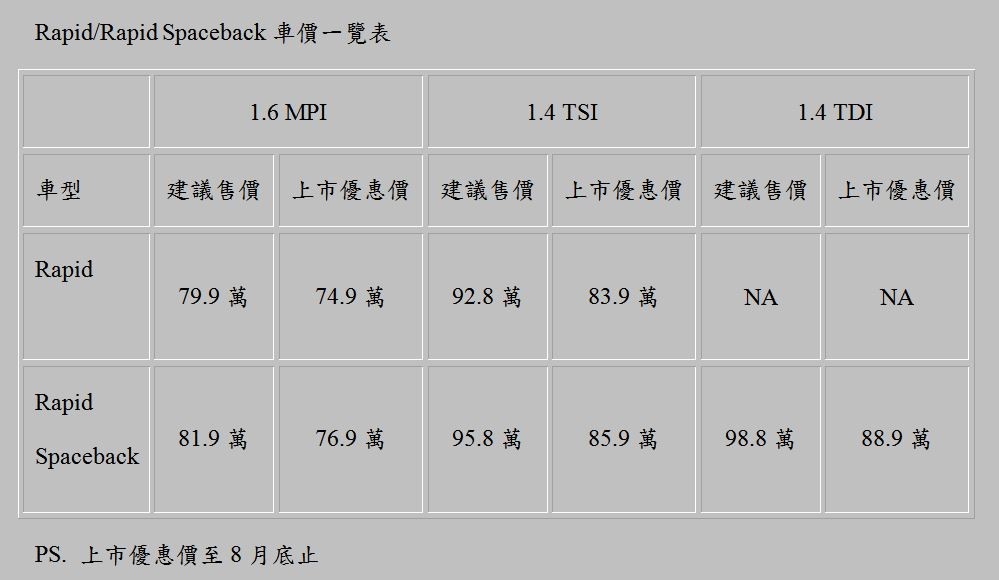 「將天空列為標準配備」的歐洲最美掀背Škoda Rapid Spaceback,將於7月1日推出全新的1.6 MPI以及1.4 TDI兩款新車型,含現行的1.4 TSI車款共有三種不同引擎動力供消費者選擇。在8月底前訂車者可享上市優惠價: 1.6 MPI:76.9萬; 1.4 TSI:85.9萬; 1.4 TDI:88.9萬。 Rapid房車則追加1.6 MPI車款,與現有的1.4 TSI車款共有二種動力選擇,8月底前同樣享有上市優惠價: 1.6 MPI: 74.9萬; 1.4 TSI: 83.9萬。