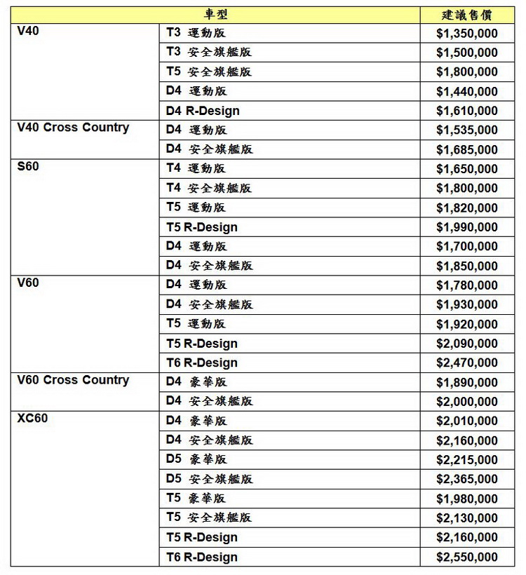 2017 年式 VOLVO 40 及 60 車系建議售價