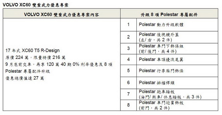 VOLVO X Polestar 性能風暴魅力即將襲捲全台,國際富豪汽車祭出原價 224 萬元的全新 17 年式 XC60 T5 R-Design 車型,除了提供限量特價 216 萬元,還可同步再享 120 萬 40 期 0% 利率優惠及價值超過 13 萬元的 8 項 Polestar 賽道級套件升級,以三項總價值達 27 萬元的優惠內容回饋所有國內豪華休旅買家。