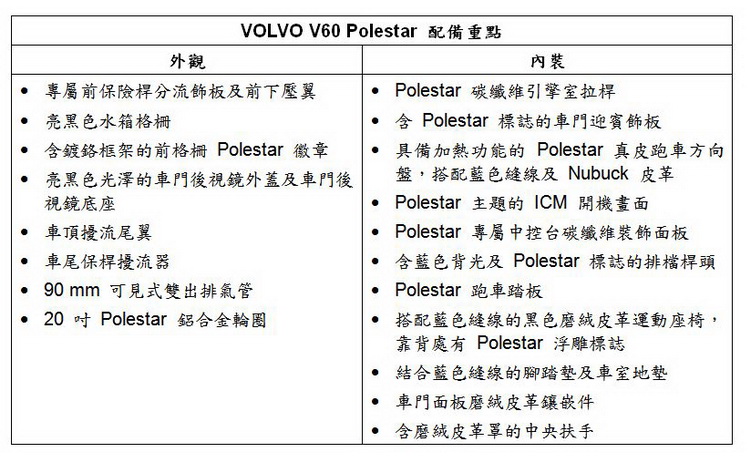 國際富豪汽車九月九日發表征戰過世界各大房車錦標賽事的原廠性能品牌Polestar與其競技級旅行車之作 V60 Polestar,完整強化品牌性能形象。在Polestar國內發表之下,國際富豪汽車同步引進多項 Polestar 賽道級性能套件,包括動力優化軟體、進氣/ 排氣系統與底盤換上專屬套件,同時亦加入 Polestar 量身打造為增添性能跑格氣息的外觀與車室內裝配件,