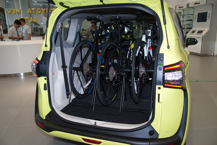 座椅變化與空間運用是Sienta的強項,三排座椅的設定最多可以坐進七名乘客,其中第二排座椅除了放平椅背之外,還可以將整個座椅向前翻,方便第三排座椅乘客進出。第三排座椅除了放倒椅背之外,如果有更大的行李置物需求的話,還可潛入式隱藏收折至車室地板內,配合第二排座椅向前翻所造出的空間足可直接放進三台公路自行車(不用拆輪喔)。