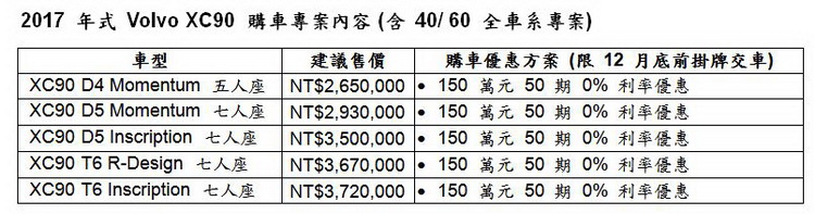 國際富豪汽車宣佈 2017 年式 Volvo XC90 全車系安全配備再升級,標配第二代 Pilot Assist 半自動駕駛輔助系統、具行人、單車及大型動物偵測暨完全主動煞車系統之 City Safety 主動安全防護系統,D5 柴油車型更搭載全球首發 Power Pulse 動力科技,提供更為線性充沛的動力反應。