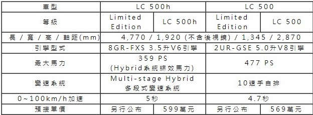 ![]() LEXUS 全新LC 500h及500將分別提供兩個車型等級供顧客選擇,其中配置較為運動化的LC 500h及LC 500,預接單價分別為599萬元及569萬元 (多退少不補),並將從3月起正式生產;Limited Edition部分,由於其專屬外觀色 - 風馳藍 (Structural Blue)採用的結構性塗料製程極為困難,將於10月起生產,預接單價將待與原廠協商後另行公布。