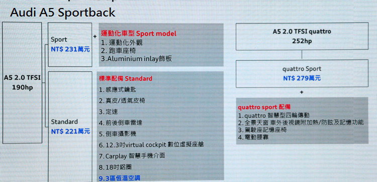![]() ▲從車頭角度放眼望去,新一代A5引擎蓋上方隆起的兩道銳利折線相當醒目。座艙擁有空間更寬敞、機能更強大的特徵,相較於前一代車型肩部和膝部空間分別增加11mm和24mm,車室空間更增長17mm,其中旗艦之A5 45 TFSI quattro車型更配備全景式玻璃電動天窗。 ![]() ▲配備等級的優勢是A5用以挑戰對手的最大武器,多媒體配備水準更堪稱是同級之最。