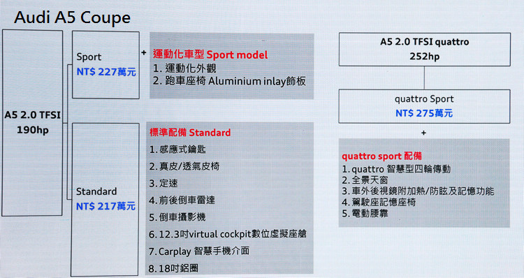 歷經9年的演進,Audi A5終獲改款,如今也正式在台上市。二代A5融合現代設計美學及Audi經典特色,在空間表現與車輛科技上均有超越對手的演出,成為今年最受矚目的豪華轎跑車。同步上市的性能車系S5則標榜全新3.0升雙渦流渦輪增壓汽油引擎,搭配輕量車體與更出色的動力,展現最熱血沸騰的駕馭熱情。隨著新車上市,台灣奧迪也宣佈即日起,「正17年式Audi全車系車款」皆享有五年保固全新服務,致力給予消費者更優質的服務。