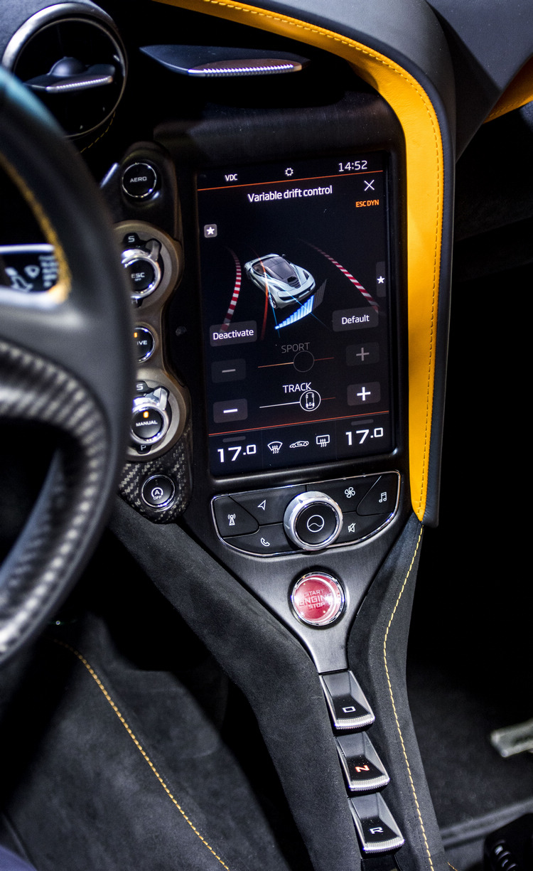 頂級內裝更重實用![]() 內裝用料同樣大幅提昇質感,整體操作介面也環繞著駕駛為設計主軸,以鋁合金切削元件搭配麂皮和頂級皮革,包裝出奢華室內氛圍。坐進駕駛座首先看見的是獨特的翻轉式儀錶設計,這也是720S另一項獨步業界的創舉,一般狀態下可用數位儀錶監控車輛資訊,激烈操駕時按個鈕就能翻轉成為賽車儀錶,以大幅簡化的超轉燈讓駕駛更為專注前方路況。