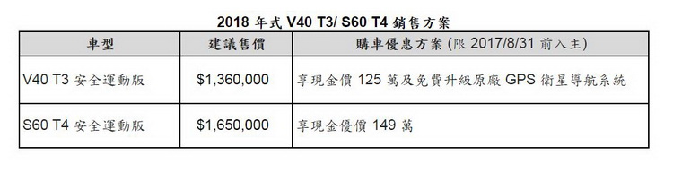 邁向 2020 年品牌零事故願景,國際富豪汽車以總價值超過 12 萬元、搭載 ACC 主動車距控制巡航系統為首等 11 項主動安全科技的升級配備列為 2018 年式 40 與 60 車系標準配備。首波強打推出 V40 T3 與 S60 T4 兩款安全運動版車型,並針對原價 136 萬 V40 T3 安全運動版,推出 8 月底前入主享現金價 125 萬之限時優惠,更加碼免費贈送原廠 GPS 衛星導航系統;同時,原價 165 萬 S60 T4 安全運動版也推出現金價 149 萬優惠。
