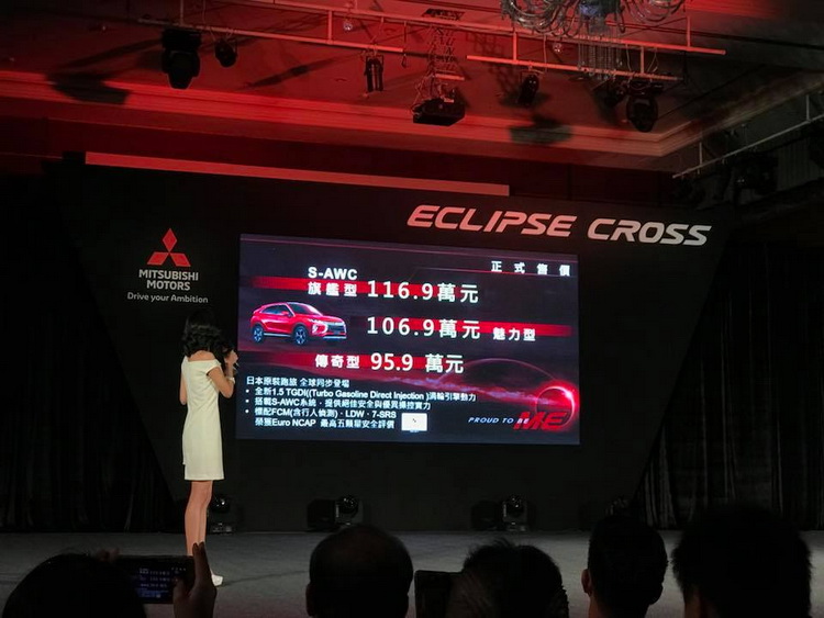 自12/5發佈預接單銷售以來,Eclipse Cross已接獲預接訂單超過百台,三個級距上市正式售價為:傳奇型 95.9萬,魅力型 106.9萬,S-AWC旗艦型 116.9萬,即日起來順益汽車展示中心賞車與試乘可獲得限量好禮「Eclipse Cross日蝕杯」,本月底前訂車送日本原廠遮物捲簾,交車再送Dyson時尚家電「Dyson V7 Trigger手持式吸塵器」或「Dyson Supersonic 吹風機(限桃紅色)」好禮2選1(市值最高16,900元)。