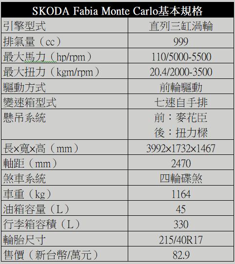 給你輕快加速感 不給你多增油耗Fabia Monte Carlo冠軍特仕版搭載了排氣量999cc的1.0 TSI直列三缸汽油渦輪引擎,可輸出110hp/5000-5500rpm最大馬力與20.4 kgm/2000~3500rpm最大扭力,搭配DSG七速雙離合器自手排變速箱。以其不到1.2噸的車重之下,1.0 TSI工作起來可說輕鬆愉快,實際試駕之下可以感受到車子起步、加速的輕快性相當好,特別是在60km/h~80km/h左右常用速域的加速性以及向高速域延伸的部分都讓人忘記它只有1.0L的排氣量。