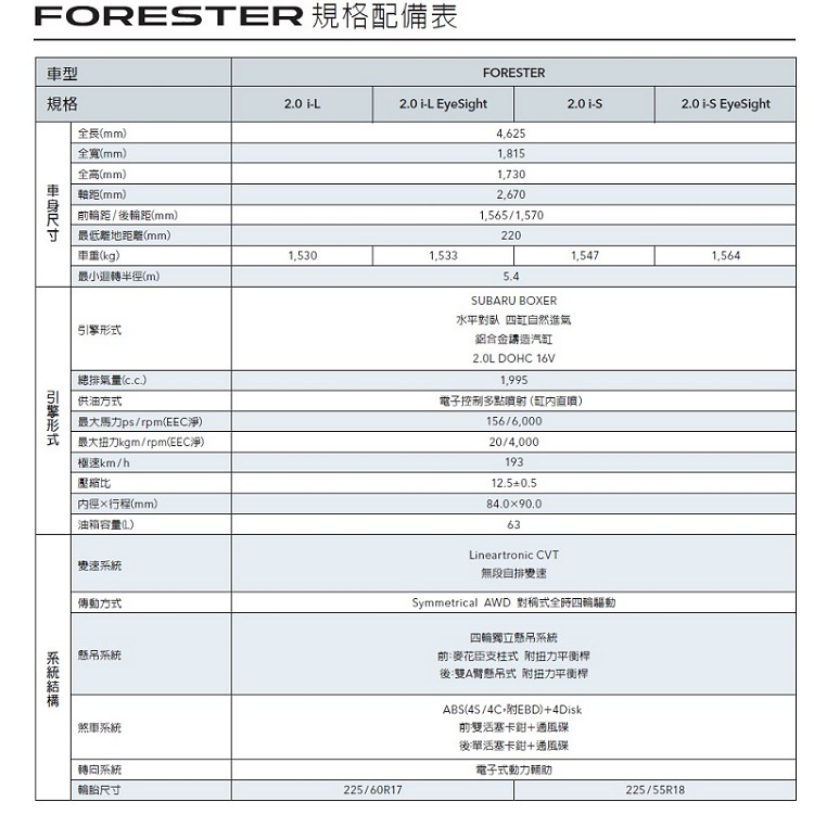 ![]() 台灣販售的第五代Forester可分為四種車型,有兩種車型有搭配主動安全Eyesight系統,而動力規格都只有單一引擎2.0升水平對臥四缸自然進氣系統,最大馬力為156hp與20kgm最大扭力。詢問了在場的日本Subaru原廠人員,為何不繼續使用渦輪增壓引擎,對方給的回答是因為空汙法越來越嚴格,尤其歐洲方面法規,渦輪增壓引擎目前無法通過更嚴苛的規定,所以提前將引擎換下準備研發環保有符合消費者需求的新引擎。在日本有2.5升自然進氣引擎,不過礙於台灣對於大排量引擎的反感,所以目前評估沒有導入的必要性。