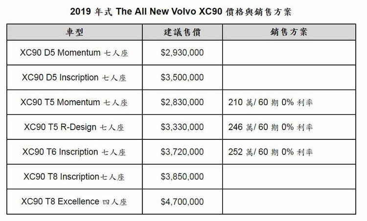 Volvo運動休旅家族老大哥XC90 2019 年式正式登場,以新規畫之 D5 Momentum、D5 Inscription、T5 Momentum、T5 R-Design、T6 Inscription 及 T8 油電複合動力車型滿足國內買家不同喜好與需求。