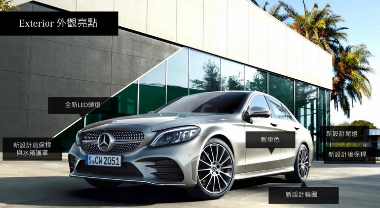 ![]() C-Class小改款外觀針對前後保桿、水箱罩重新設計,並提供超過 10 種新型輪圈、兩種新車色供選擇。