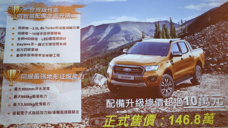 福特六和正式引進最新改款的Ford Ranger Wildtrak,全車除了內外質感再進化,並升級超過10萬元之配備,並將動力全面換裝為最新2.0升Bi-Turbo雙渦輪增壓柴油引擎,並且匹配十速手自排變速系統,馬力、扭力與節能表現均較現行3.2升車款更好。新款Ford Ranger將採單一車型方式銷售,售價為146.8萬元。