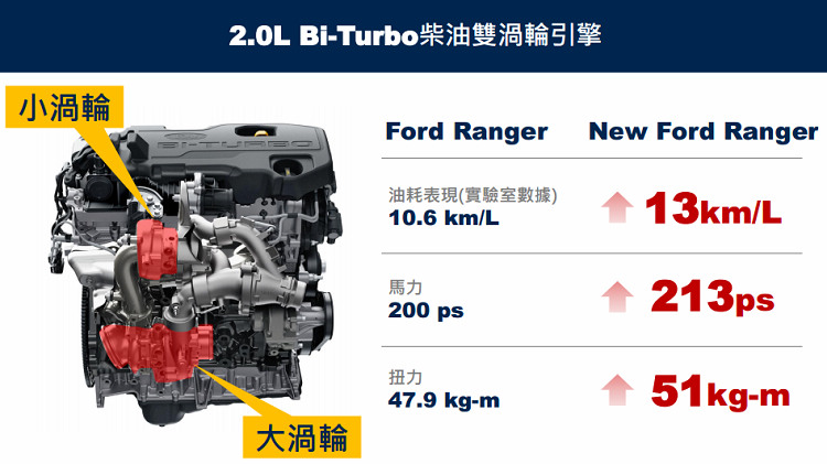 ![]() ▲全新引進的New Ranger排氣量由3.2升降為2.0升,但馬力、扭力和節能表現更優異,加上全車配備升級,以強悍的產品力展現其鞏固運動皮卡銷售冠軍車的決心。Ford Ranger長久以來都是為亞太地區多國的暢銷冠軍車,近年在歐洲市場銷售表現也極為亮眼,至於台灣引進之車型為車系高階版本,本次小改款更在動力、質感、舒適與便利性等面向加以強化,使其更符合RV玩家的需求。 ![]() ▲受到車迷期待的2.0升雙渦輪柴油引擎果真引進,透過一大一小渦輪機,在低、中、高轉速域都各以不同方式發揮增壓優勢,使得渦輪遲滯現象盡可能降到最少。