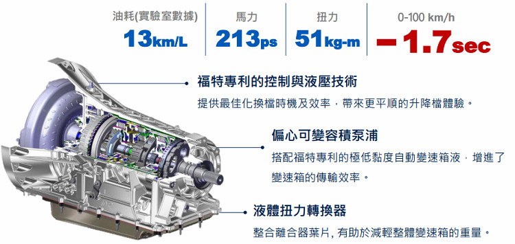 2.0升雙渦輪柴油引擎+10AT![]() ▲全新導入之動力引擎,是與Ranger Raptor性能皮卡共用的全新2.0L Bi-Turbo柴油雙渦輪引擎。全新導入之動力引擎,是與Ranger Raptor性能皮卡共用的全新2.0L Bi-Turbo柴油雙渦輪引擎,最大馬力提升約7% 至213ps,最大扭力亦增加約6%達到51.0 kg-m,搭配SelectShift十速手自排變速系統。0-100 km/h加速時間縮短1.7 秒,根據測試結果,平均油耗表現可達13km/L。 ![]() ▲新引擎享有更低的稅賦優勢,動能表現更好,勢必對於潛在買家的吸引力有加分效果。![]() ▲同樣與Ranger Raptor性能皮卡共用的十速手自排變速箱,和新的動力系統匹配完美。