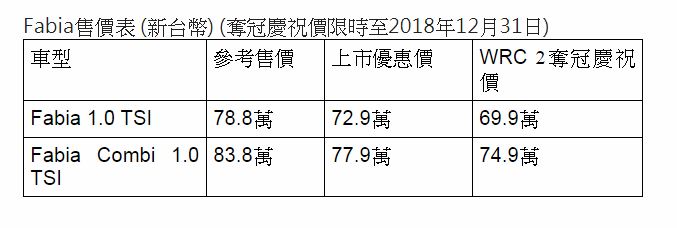 售價上,Fabia從改款前的優惠售價75.9萬,再加上ACC、AEB、Blind Spot與後方倒車警示系統等標準配備後,改款新車反而是破盤端出優惠售價72.9萬元的超值方案,於今年12月31日前購車更享有WRC 2奪冠慶祝價。