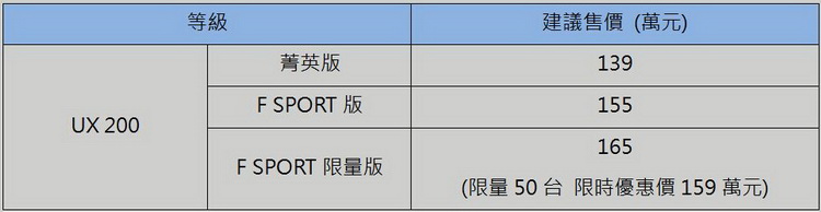 LEXUS總代理和泰汽車正式發表品牌運動休旅車家族中的最新、也是最小的成員UX 200都會豪華跨界休旅。外觀上,車頭的紡錘型水箱護罩以廠徽為中心,以多角塊狀形漸層向外擴散至突出的輪拱。車側諸多雕琢的車身線條不但以張力勾勒UX的運動感,在C柱收斂後,與高辨識度的尾燈結合。