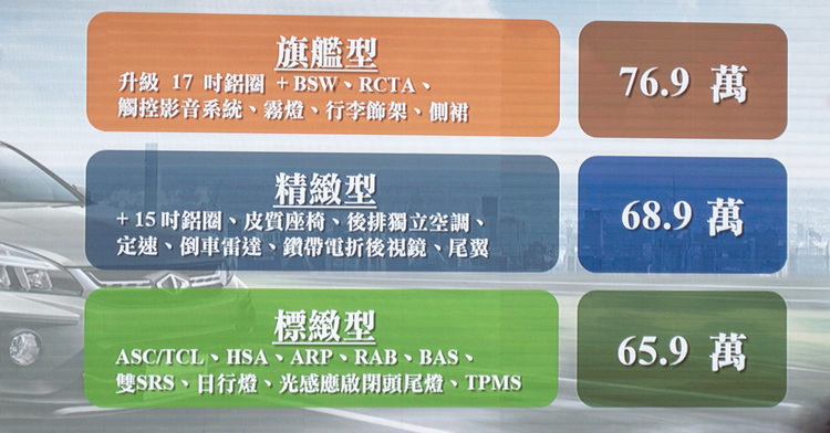 售價65.9萬起,並提供五人座客車型 新ZINGER推出76.9萬旗艦型(擁有多功能影音系統、BSW盲區偵測、17吋鋁圈/胎、鋁合金車頂飾架、後保桿不銹鋼飾條、側裙、等超值配備)、68.9 萬精緻型與65.9萬標緻型等3種超值車型;另發揮大空間優勢推出5人座客車車型,提供多元計程車優質選擇,適合接送出國旅遊等大行李裝載需求之客戶(客車優惠價格請洽各展示中心)。
