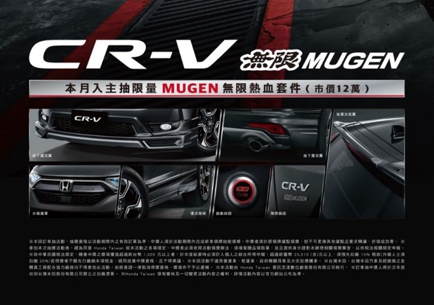 Honda Taiwan 今年在台灣達成40萬輛車生產下線,而第40萬輛車正是深受顧客喜歡的車款 Honda CR-V ,對此Honda Taiwan為了因應廣大粉絲的渴求,針對CR-V特別引進日本無限MUGEN開發「CR-V無限MUGEN熱血限量套件」,其中包含「前下擾流翼」、「後下擾流翼」、「後擾流尾翼」、「無限水箱護罩」、「擾流側裙」及專屬無限「MUGEN銘牌」及「啟動按鈕」。