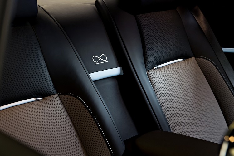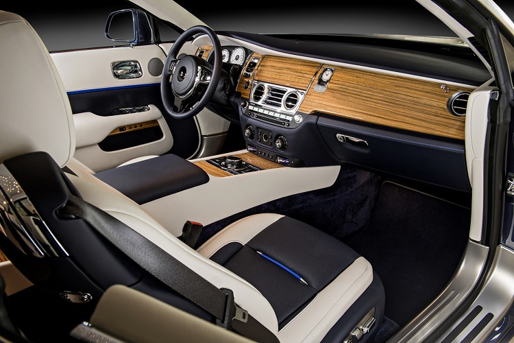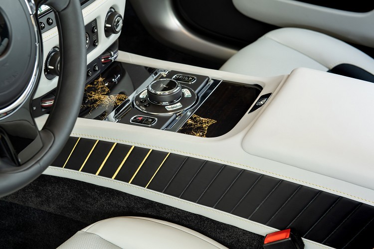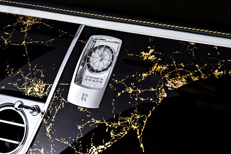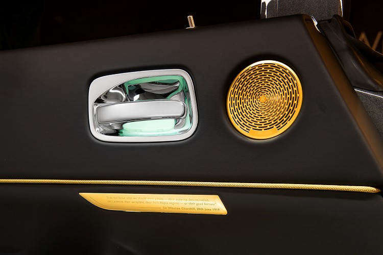 而在內裝部分則延續了外觀的設計概念,以黑色及塞爾比教堂灰雙色皮革的搭配,加上金沙色縫線點綴呈現出復古卻不失經典的語彙。而在車內音響揚聲器材質也選用個黃銅材料,而外蓋刻印著1,880 miles字樣,代表著John Alcock和Arthur Brown橫跨大西洋的飛行距離。而座椅頭枕的勞斯萊斯標誌也用了金沙色絲線縫製而成,駕駛座門板上更鑲嵌了一塊銘牌上面刻著當時英國首相邱吉爾對於這項壯舉的評語: 「我不知道我們最應該佩服的是他們的膽識,決心,技能,科學,他們的飛機,勞斯萊斯引擎或是他們的好運氣。」