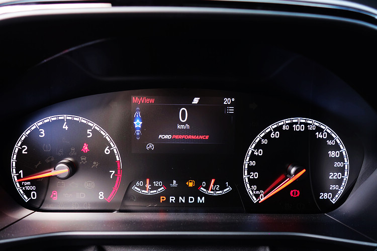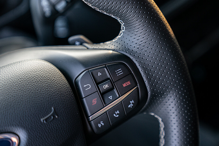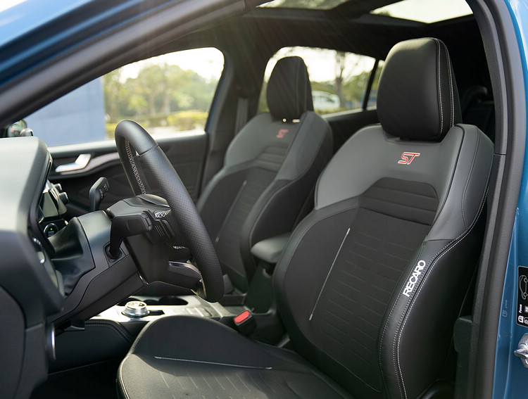 內裝部分,採用運動碳纖維紋路飾板搭配闇黑頂篷、專屬RECARO賽道型座椅,至於ST專屬平底運動化方向盤於右側多功能按鍵附「S」按鍵與「Mode」選擇模式鈕,駕駛人可在目不離路的狀態下迅速切換動態模式。 ![]() ▲駕駛者亦可透過儀表板中的4.2吋全彩LCD液晶智慧多功能儀表板查看車輛資訊。![]() ▲ST專屬平底運動化方向盤,於右側多功能按鍵附「S」按鍵與「Mode」選擇模式鈕。