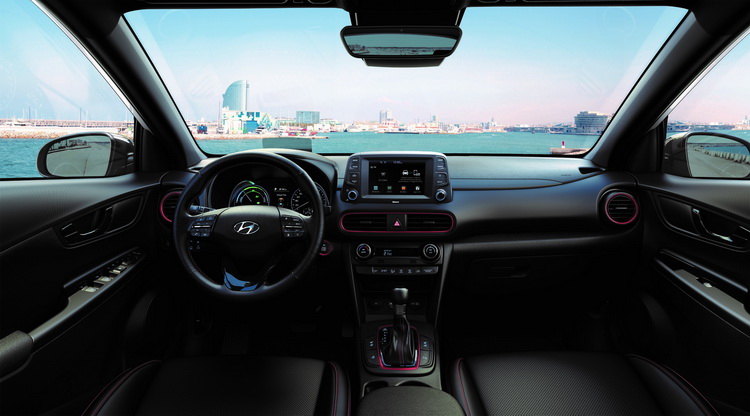 個性化潮內裝配備滿載 讓每段旅程都精采 全新Kona Hybrid的車室內裝鋪陳同樣精彩,不僅運用跳脫過往刻板框架的創新設計語彙,更榮膺美國權威雜誌WardsAuto評鑑為全球十大最佳內裝大獎的肯定;以海灣為設計靈感的中控台總成和車門扶手搭配高質感軟質塑料,提供十分寬敞舒適的車室空間感受,並透過Red-Line車室套件以鮮紅色調襯托方向盤縫線、車門飾條、安全帶、座椅縫線、座椅滾邊飾條等細節,強調全新Kona Hybrid熱血十足的駕馭取向。其他內裝配備同樣令人愛不釋手,包括高質感黑頂篷、夜幕套件(含車門把手、冷氣飾框及排檔座)等,至於全車運動化皮質/織布混搭座椅無論是支撐包覆性或整體乘適感受都具備高水準的演出。