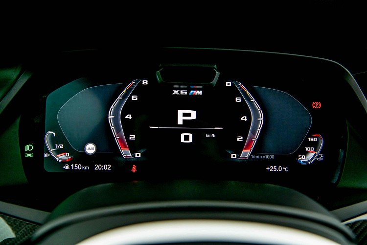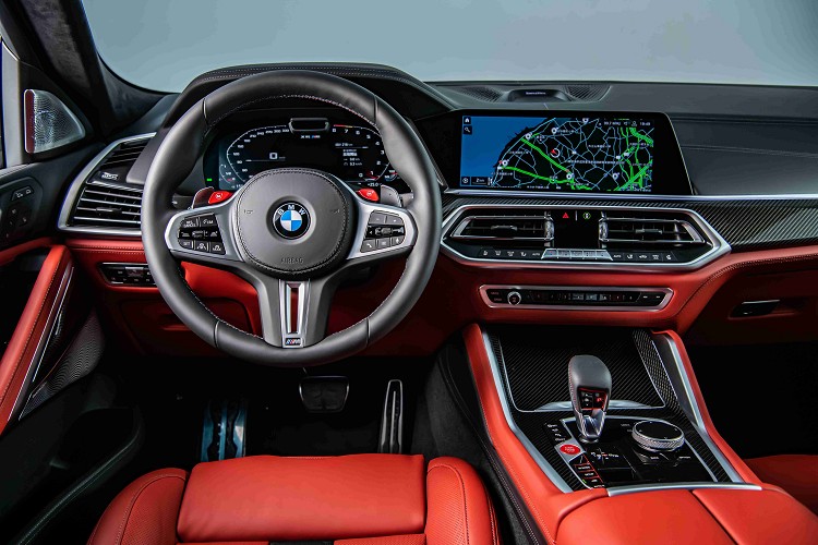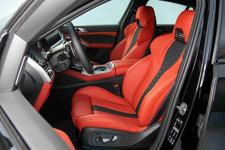 進入車室空間,全新BMW X6 M廣闊的乘坐高度提供駕駛全方位視野,標準配備的全景式電動玻璃天窗在白天提供自然採光同時營造出更寬敞的空間感,豪華運動跑旅的越野氛圍。Merino皮革M專屬雙前座跑車座椅、M縫線安全帶與Individual Alcantara麂皮車內頂篷,為X6 M與生俱來的運動氣息增添奢華感受。坐定後映入眼簾的M專屬多功能真皮方向盤、真皮包覆儀表檯及碳纖維材質飾板,彰顯強烈運動化感官享受;最新一代的M專屬車況抬頭顯示器除了顯示時速與車況外,帶動駕駛熱血的轉速也能同時一目了然。