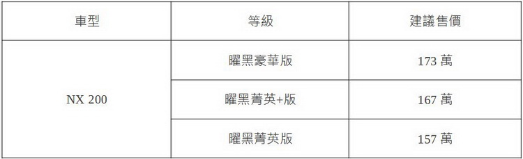 自去年起,2020年式NX車系即全面標配LEXUS Safety System+ 2.0智動駕駛輔助系統、Apple CarPlay及Android Auto智慧型手機連結等消費者期待已久之配備。今年,LEXUS再度針對NX 200全等級進行商品強化;限時限量推出曜黑時尚車型 – 導入曜黑水箱護罩、曜黑車外後視鏡,並升級18吋 F-Sport銑黑鋁圈等市價超過4萬元之外觀套件。這次特仕車僅針對菁英、菁英+兩等級加價1萬元,而豪華等級價格則維持不變。
