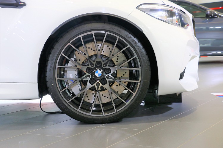 輪圈之下,M2 Competition Conquest Edition標準配備全新M運動化煞車套件,複合式通風碟盤中央採用鋁合金材質減輕車輪重量,並且透過氣孔與碟盤結構有效地排塵散熱,引人注目的灰色造型前6後4活塞固定式卡鉗搭配加大碟盤(前400 x 36mm, 後280 x 28mm),在駕駛者激烈操控時提供更強大敏銳的煞車力道及絕佳的散熱效果。