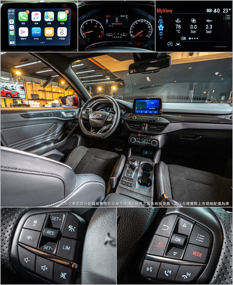 空間與機能表現![]() Focus ST Wagon在標準5座模式下,即擁有高達近694公升的行李廂容積,後座亦提供六四分離機制,並配備行李廂後座一鍵式傾倒開關,可便利快速地將行李廂容積擴展至1,576公升;標配足踢感應式電動尾門與車頂行李架,滿足生活便利與多元運用之需求。內裝其餘標配包含:8吋懸浮式全彩LCD觸控螢幕,SYNC 3及原廠中文衛星導航系統,儀表板4.2吋全彩LCD液晶智慧多功能顯示幕、全景式大型電動天窗系統、四門伸縮型防護邊條、B&O重低音環艙音響、Qi無線充電座、HUD智慧型抬頭顯示器等配備。