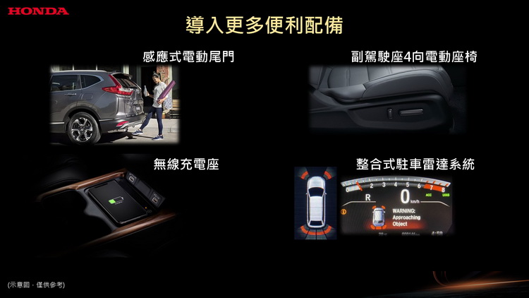 新CR-V以霸氣風貌所勾勒的身影,結合翼形LED陣列頭燈及日行燈、LED霧燈及直列式尾燈,讓整體線條輪廓更顯銳利前衛;並導入更多消費者喜歡且實用的裝備,包含無線充電座 (S/VTi-S)、副駕駛座四向電動座椅調整 (S)、感應式電動尾門 (S)、PSS駐車雷達系統 (S) ,提升了更強烈的科技質感及便利的使用介面。