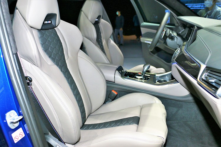 進入車室空間,全新世代BMW X5 M廣闊的乘坐高度提供駕駛全方位視野,標準配備的全景式電動玻璃天窗在白天提供自然採光同時營造出更寬敞的空間感,豪華休旅的越野氛圍。Merino皮革M專屬雙前座雙色跑車座椅、M縫線安全帶與Individual Alcantara麂皮車內頂篷,為X5 M與生俱來的運動氣息增添奢華感受。坐定後映入眼簾的M專屬多功能真皮方向盤、真皮包覆儀表檯及碳纖維材質飾板,彰顯強烈運動化感官享受。