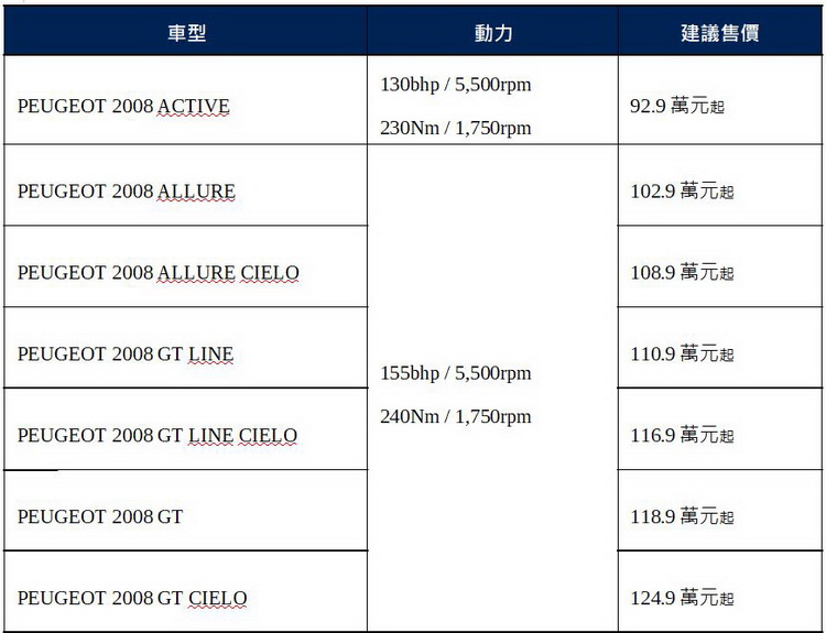 PEUGEOT 2008將於2020年11月14日進駐PEUGEOT全台展示中心,建議售價92.9萬元起,同時PEUGEOT總代理 寶嘉聯合推出限時限量早鳥專屬優惠,包含高額分期超低利率,再加贈3年3萬公里免費保養,活動只到2020年12月31日,售完即止。