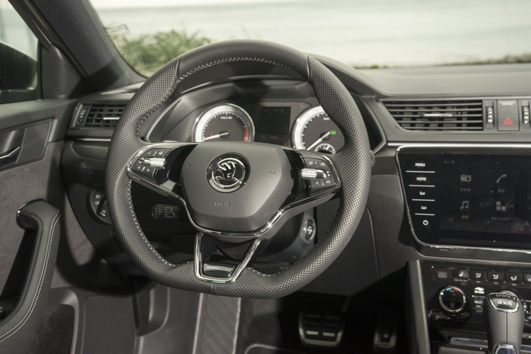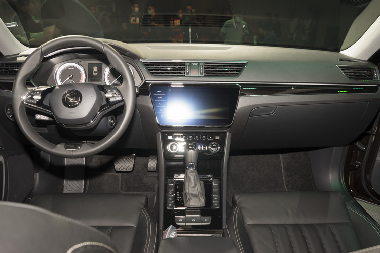 SUPERB改款新車的內裝設計也令人耳目一新:排檔區與中控台都採用高質感的類3D飾板;有10色可選的內裝氛圍燈自中控台延伸至前後門把,增添這款旗艦的豪華與精緻感。此次並因應科技風潮新增Type-C以及Type-A充電插槽各一,滿足現代人為自己3C產品充電需求。方向盤設計也依車型區分為:懸浮式飛梭滾輪多功能方向盤與SportLine車型專屬的三幅式跑車平把方向盤。